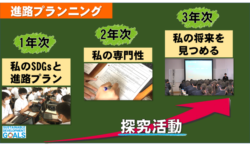 前橋東高校では、「産業社会と人間」と「総合的な探究の時間」を合わせ、「進路プランニング」という授業を展開しています。1年生では、生徒一人ひとりが自分の将来つきたい職業や生き方について深く考え、SDGsとからめて検討をします。職業観や自分のあるべき姿を考えて、自身の進路について考えます。2年次から多くの科目を選択し、自分の専門性を高めながら、研究テーマを掘り下げます。3年次には、これまでのまとめをしながら、将来の進路希望に応じた課題研究に取り組みます。1年次から3年次まで継続して探究活動を行うことで、自身の探究心を伸ばすことができます。