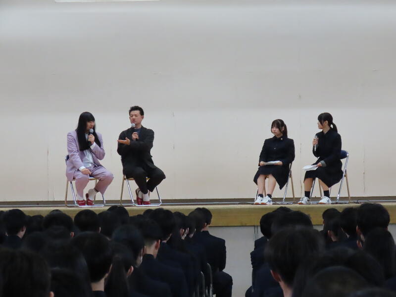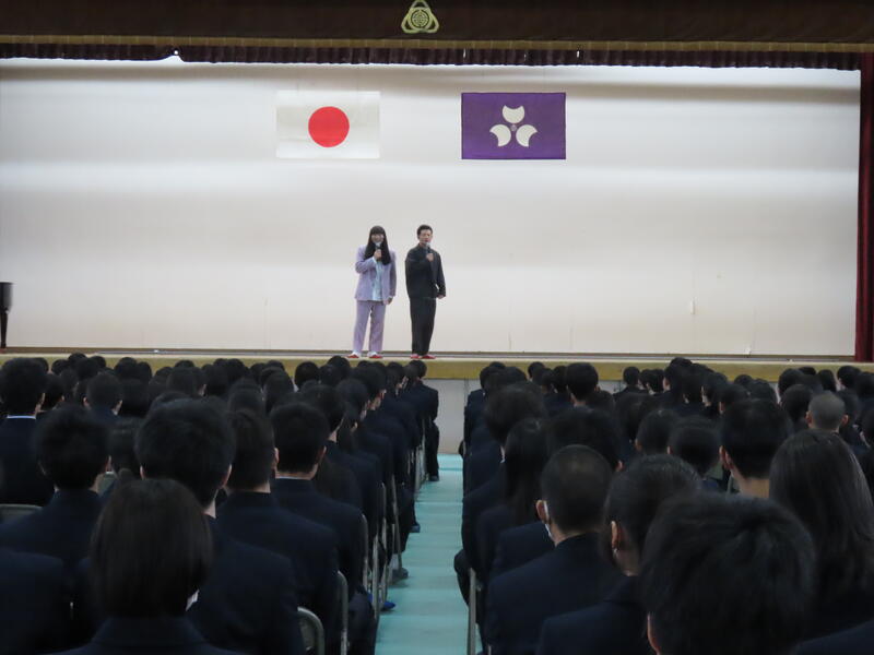 創立記念講演会では、タイタン所属のお笑いコンビ「ネコニスズ」の舘野 忠臣 氏(本校卒業生)と山元 康輔 氏に、インタビュー形式の御講演と漫才の実演をしていただきました。