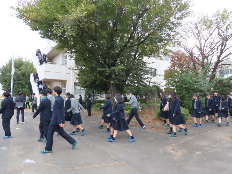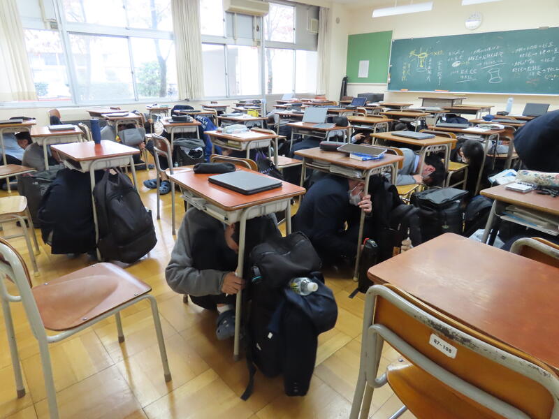 はじめに緊急地震速報対応行動訓練を行い、シェイクアウトの姿勢の取り方を確認しました。その後、学校での地震・火災発生に際し避難行動を適切に行えるように避難訓練を行いました。