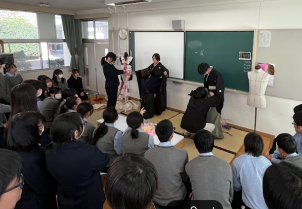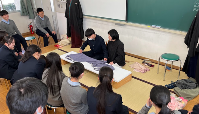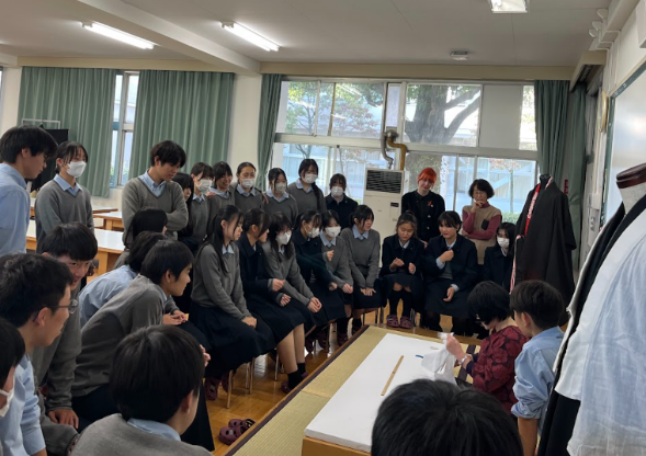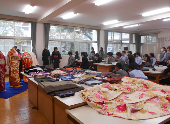 1時間目は和裁士の仕事や展示された着物や布見本を用いながら和服の文化や特徴についてご説明いただき、2時間目は、実際に工房で使用している道具を用いて、反物の扱いや「運針」や「三つ折りぐけ」など和裁の基本技術の実演をしていただきました。また、実際に振袖、羽織袴、花嫁衣裳の打掛などを着たり触れたりして、和服や日本の文化を身近に感じる機会となりました。