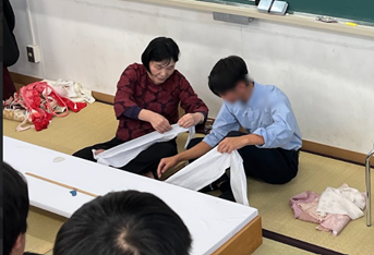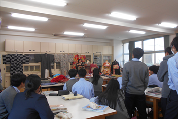 1年次「家庭基礎」授業において、厚生労働省認定のものづくりマイスターで現代の名工にも選ばれた和裁技能士 川岸美枝子先生を招いて各クラス2回の授業が行われました。(今年度で5年目)