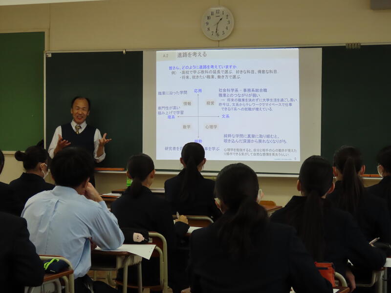 10月25日、二学年を対象に系統別大学模擬授業が行われました。医・歯・薬・保健、看護、工学、理学・情報、社会・メディア・法律・政治、経済・経営・商学、家政・生活・健康・スポーツ、教育、外国語・国際、文学・人文・心理の10分野に分かれ、群馬大学、群馬県民健康科学大学、群馬県立女子大学、新潟大学、東洋大学、尚美学園大学、神田外国語大学の先生による授業を体験しました。