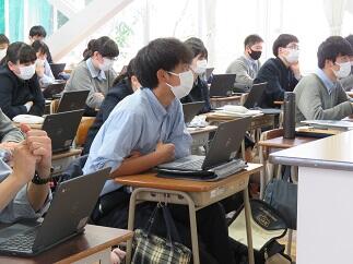 また、5月19日に前期生徒総会が行われました。こちらも生徒会本部役員、放送部、専門委員会の委員長は第一体育館で、他の生徒は各教室での参加となりました。各教室では一人一台端末を使用し、資料を閲覧しながら、体育館とオンライン会議でつなぎ、質疑応答や承認など行いました。