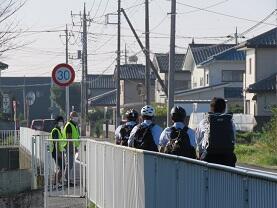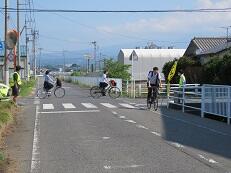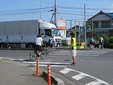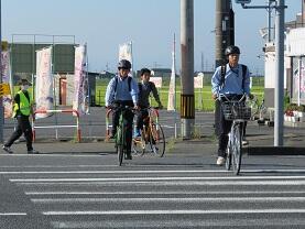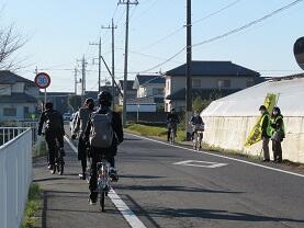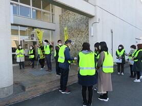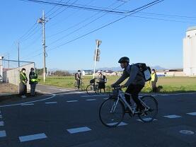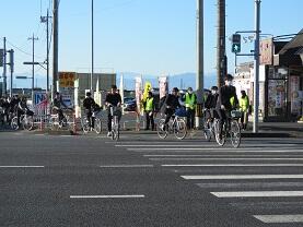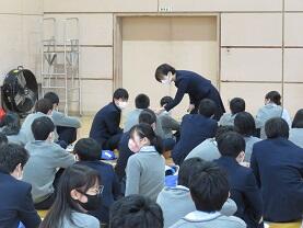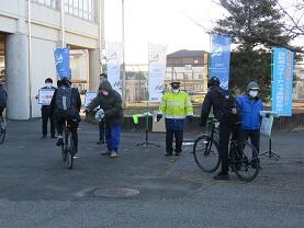 1月14日の登校時間に、県道路課と前橋東警察署の方が来校し、自転車ヘルメット着用の啓発を目的とした朝指導が行われました。