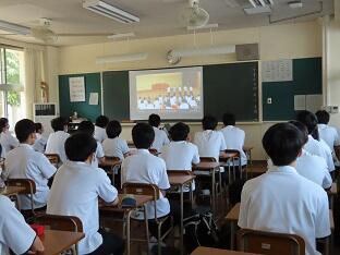 コロナウイルス感染症対策のため、創立記念式典に代わり、放送で創立記念行事を行いました。生徒は各教室で資料を見ながら参加しました。