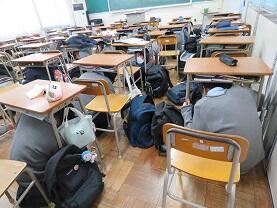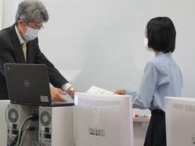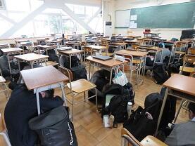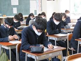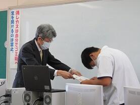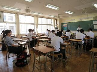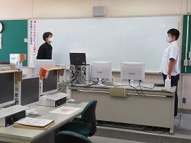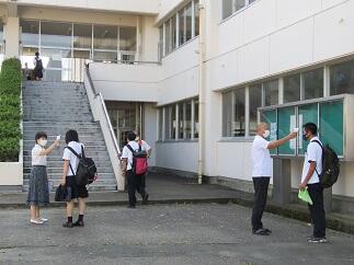 8月30日から2学期が始まりました。新型コロナウイルス感染症対応の緊急事態宣言に伴い、分散登校を実施しています。始業式は午前と午後に分けて、放送やオンライン会議を使って行いました。また、登校時には生徒用玄関で検温を実施しています。
