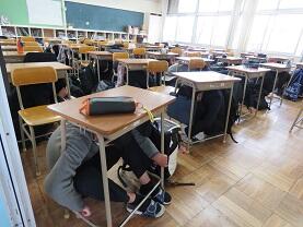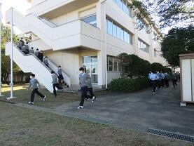 はじめに地震を想定したシェイクアウト訓練を、その後に火災を想定した避難訓練を行いました。避難訓練では感染症対策のため密にならないように、学級ごとに時間をずらして屋外への避難経路を確認しました。