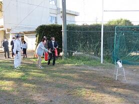 日頃から緊急事態を想定し対策をするための機会となるように、シェイクアウト訓練後の火災を想定した避難訓練を実施しました。3密回避の観点から、屋外への避難は学級ごとに時間をずらして、避難経路を確認しました。また、職員が水消火器を使用して消火訓練を行いました。