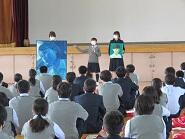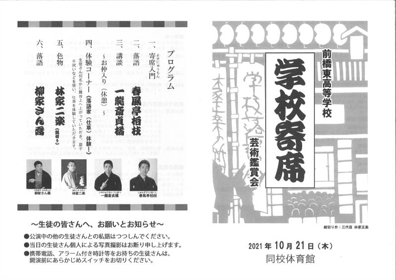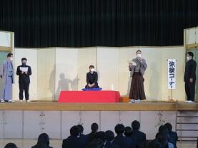 昨年度は中止となってしまいましたが、毎年行っている芸術鑑賞教室を実施しました。今年度は「学校寄席」ということで、落語を柳家さん喬さんと春風亭柏枝さん、講談を一龍斎貞橘さん、紙切りを林家二楽さんに披露していただきました。感染症対策のため、3年生は体育館で、1,2年生は教室でリモートでの鑑賞となりましたが、体験コーナーがあったり、紙切りでは生徒のリクエストしたものを作って頂いたりと、楽しい時間を過ごせました。