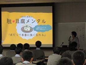 放課後に、文化委員主催の校内小講演会が多目的室で行われました。今年度は本校体育科 野球部顧問の小暮先生に「脱・豆腐メンタル『君だって本番に強くなれる』」というテーマで講演して頂きました。部活動単位での参加もあり多くの生徒がメモをとりながら真剣に聴いていました。