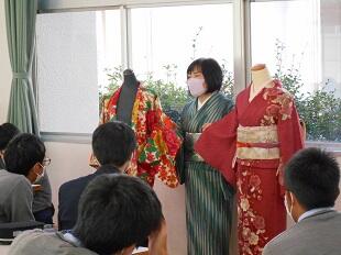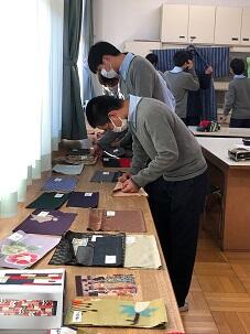 展示された着物や布見本を用いて、和服の文化や特徴についてご説明いただき、また、「くけ」や「三つ折りぐけ」など和裁の基本技術の実演も行われました。生徒達は、実際に着物や布に着たり触れたりし、和服の文化やその卓越した技術に魅了されていました。