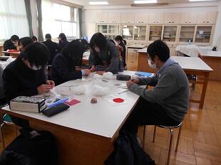 12月24日(金)学校家庭クラブ行事として、実技講習会「飾りお手玉づくり」が行われ、希望者18名の生徒が参加しました。11月の1年次家庭基礎の授業でもお世話になった和裁技能士 川岸美枝子先生を講師にお招きし、和裁の技法を用いたお手玉の作り方を教えて頂きました。細かい作業に苦戦しながらも、全員がかわいいお手玉を完成させました。