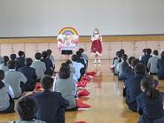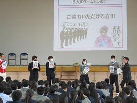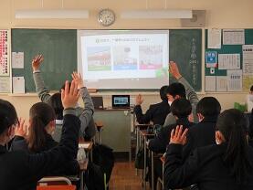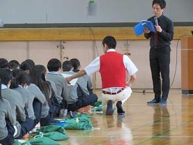 一般社団法人日本自動車連盟群馬支部の方に来ていただき、「ドライバー・自転車・歩行者から見た交通安全」の講話をしていただきました。密にならないように、5時間目に2年生、6時間目に1,3年生と時間をずらして行いました。