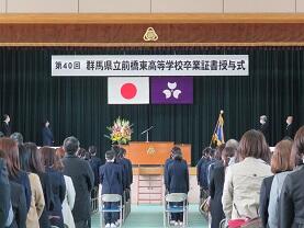第40回卒業証書授与式が本校体育館で挙行されました。新たに237名の卒業生が本校から巣立っていきました。コロナウイルス感染症予防のため、在校生は各教室でリモートによる参加となりました。また、卒業証書授与式後に同窓会入会式及び記念品贈呈が行われました。