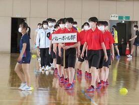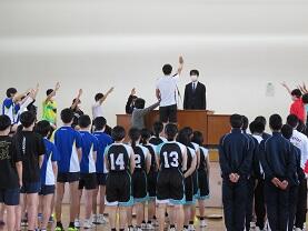 高校総体出場選手結団式・壮行会を行いました。今年度も3密回避の観点から、出場選手と吹奏楽部は体育館で、その他の生徒は放送部による中継を教室でみる形式で参加しました。