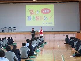 3年生を対象に、「選挙出前授業」が行われました。これは群馬県選挙管理委員会実施の民間ノウハウを活用した選挙授業「笑える!政治教育ショーin群馬」で、コミュニケーションのプロであるお笑い芸人を講師として、ロールプレイやクイズを通じて楽しみながら学習することで、高校生が政治・社会問題を自分事として考えるきっかけを作り、「若者の政治参加」「始動人の育成」につなげるものです。