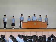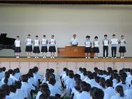 一学期終業式と生徒会任命式、表彰、そして、柔道部、カヌー部、文芸部、放送部の全国大会とバレー部の関東ブロッ大会への壮行会を行いました。